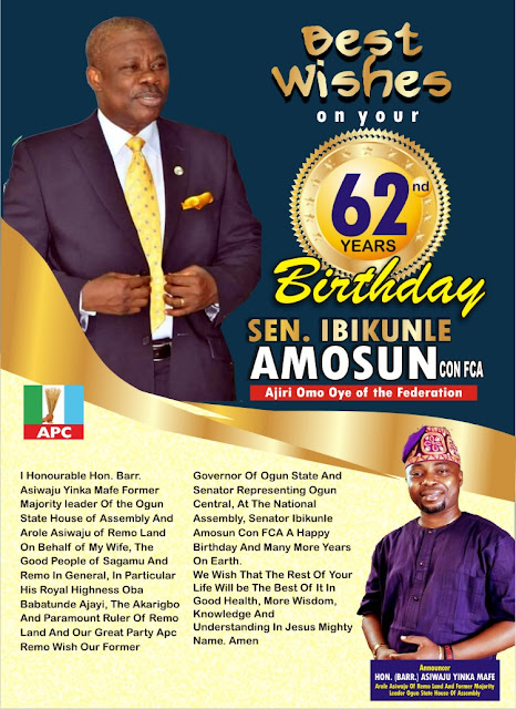 I Hon. (Barr.) Asiwaju ‘Yinka Mafe felicitate with our active, viable and indefatigable Leader, former Governor of Ogun State and current Senator of the Federal Republic of Nigeria, Senator Ibikunle Amosun (CON FCA) also known as (Ajiri One of the Universe).